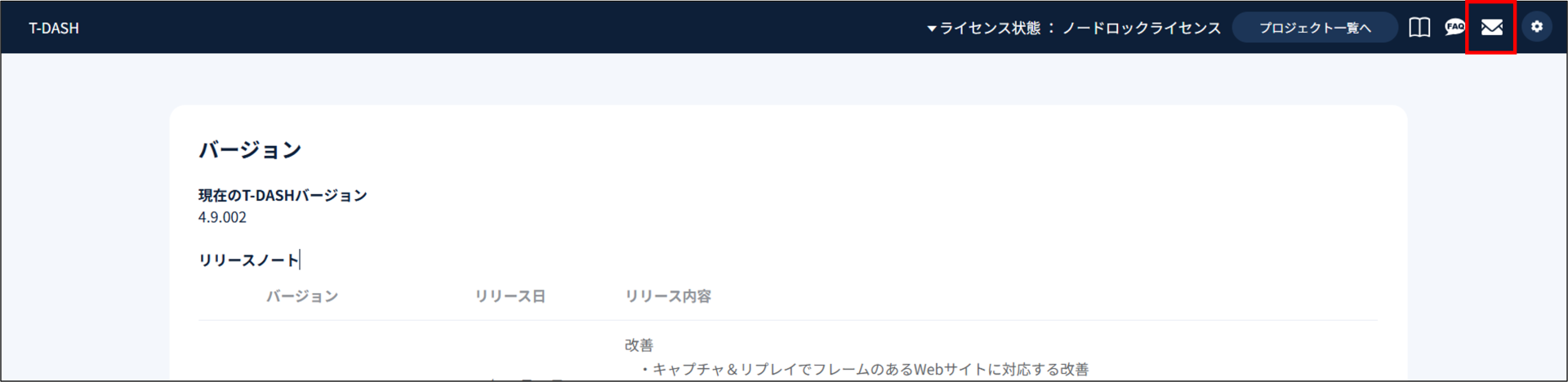 T-DASHを起動後、上部メニューバー右上にある「お問い合わせ」アイコンをクリックしてください。