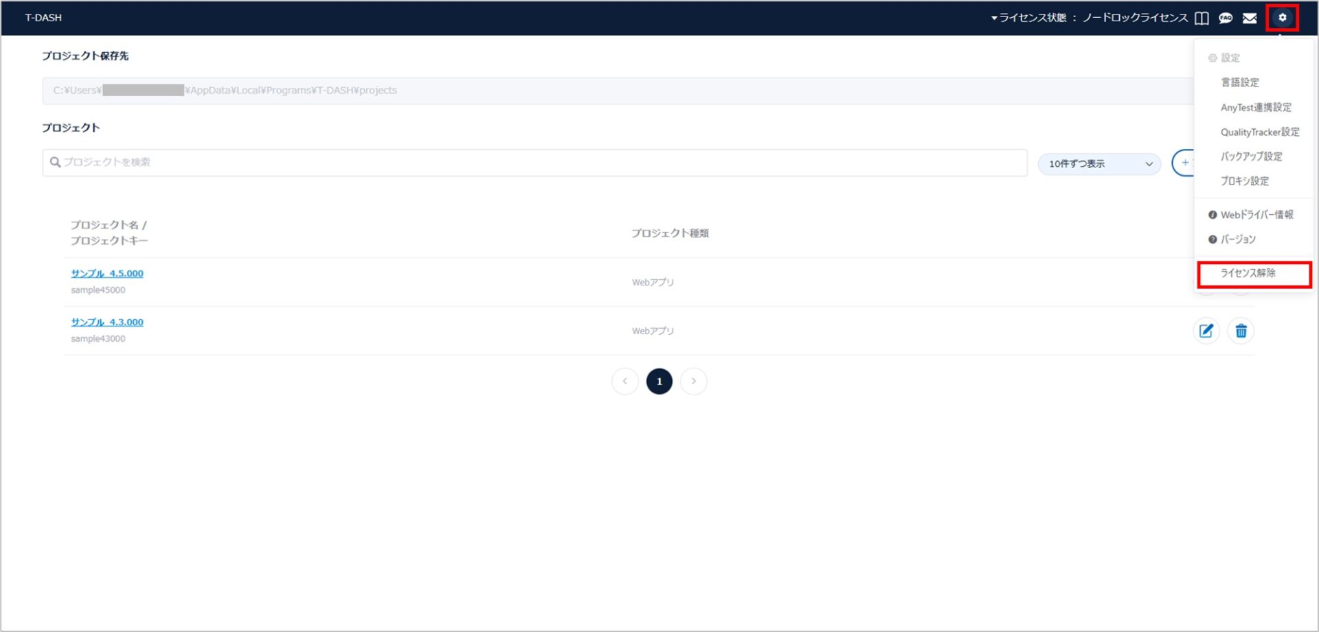 1-1. T-DASHを起動し、「設定(歯車マーク)」→「ライセンス解除」の順にクリックします。