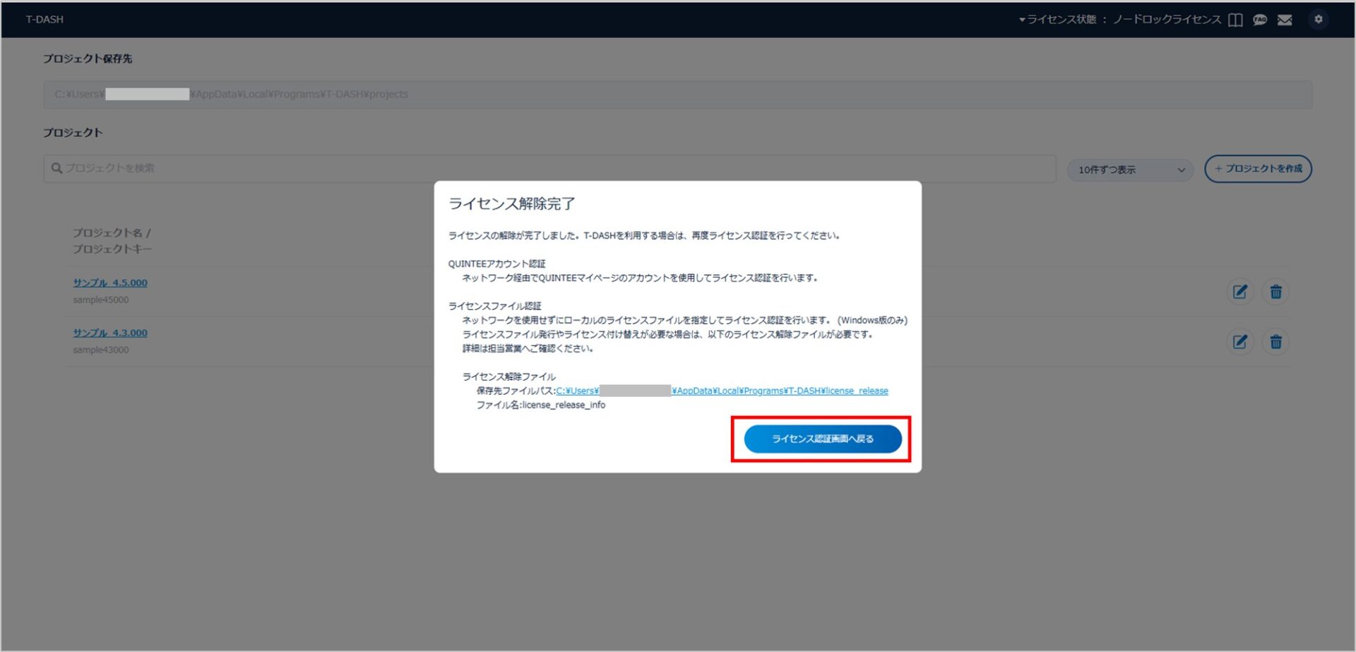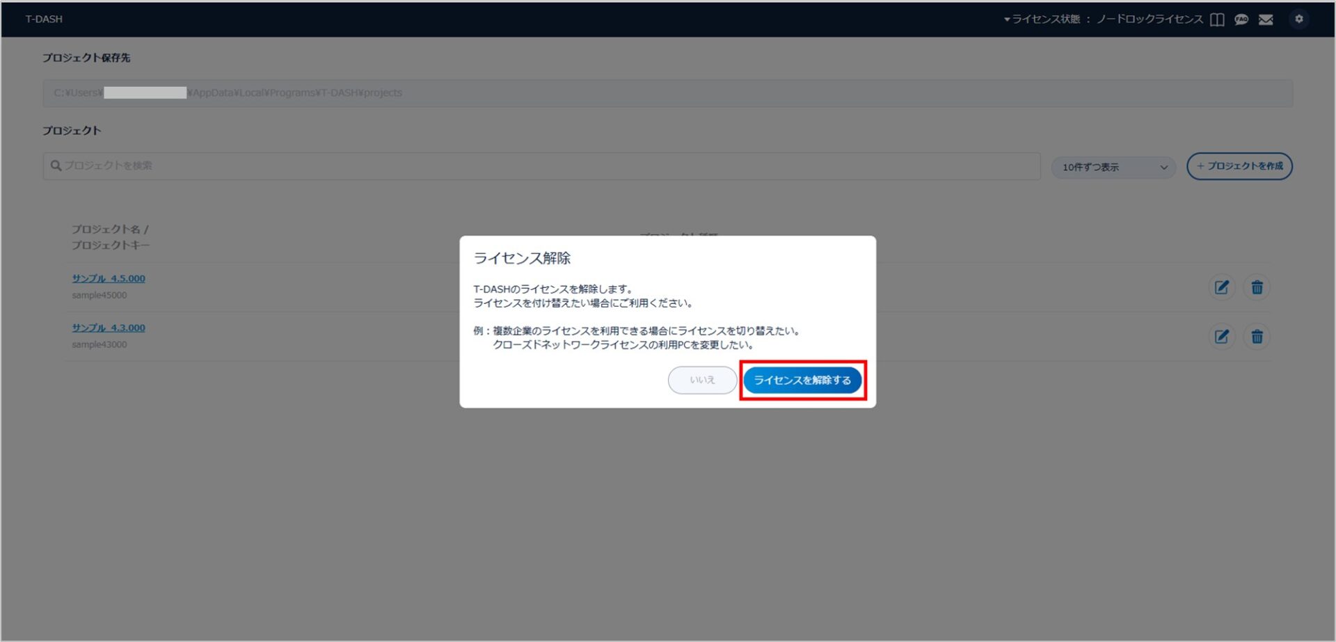 ライセンスを解除すると、新しいライセンスが発行されるまでT-DASHが利用できません。