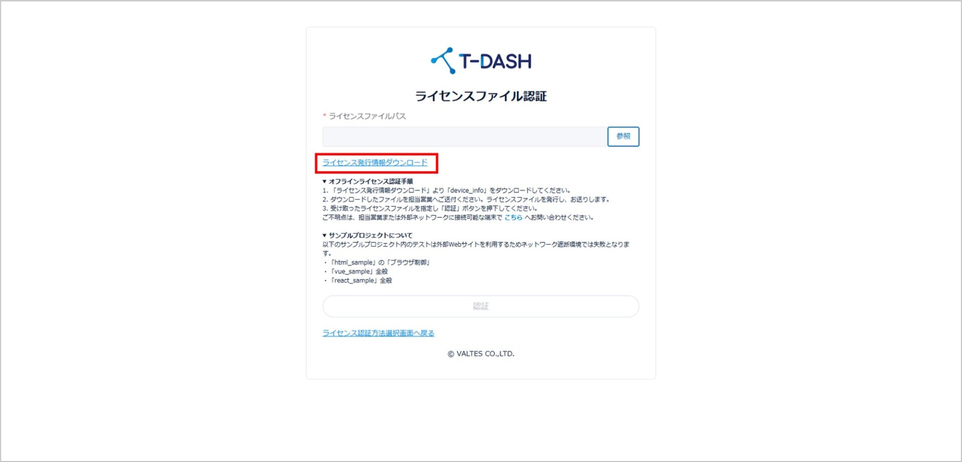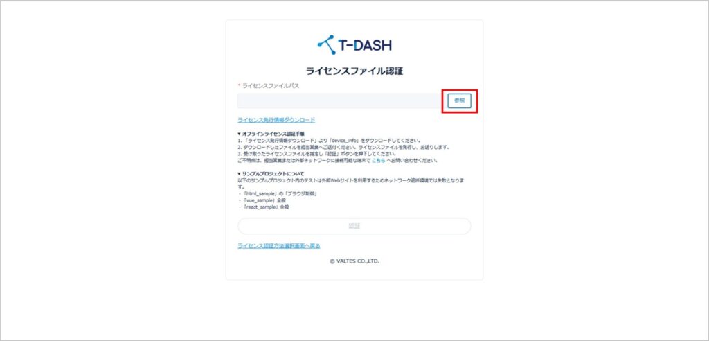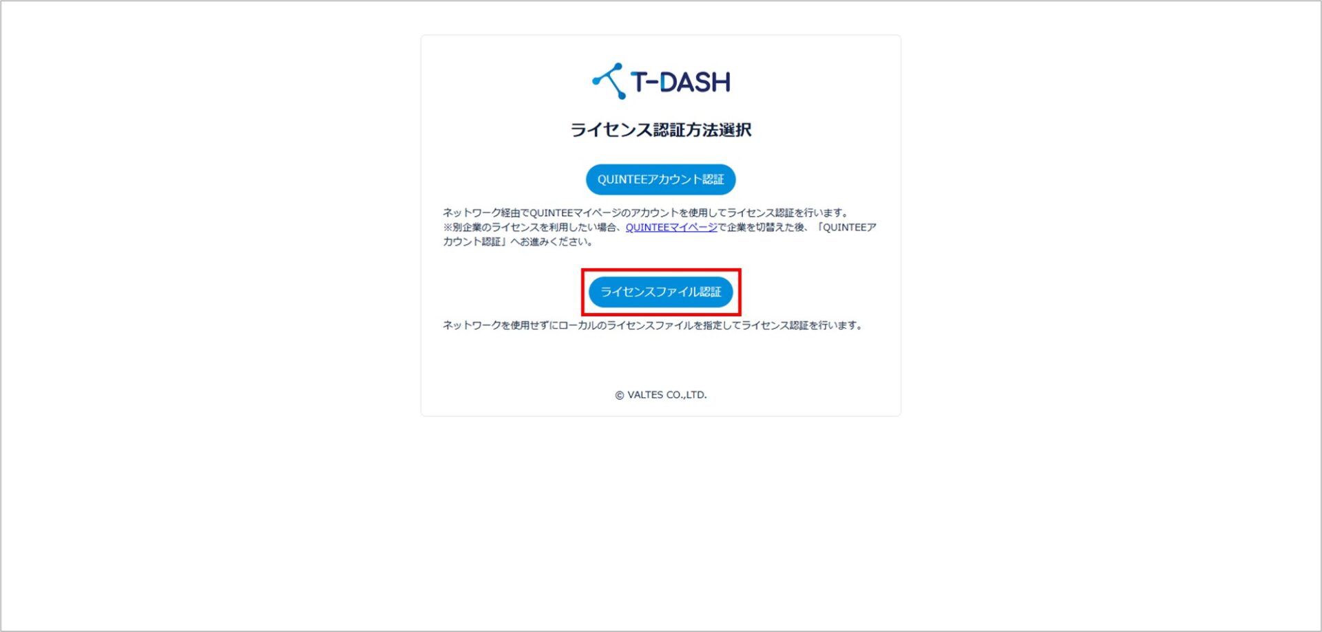 2-2. T-DASHを起動すると、ライセンス認証画面が表示されます。「ライセンスファイル認証」をクリックします。