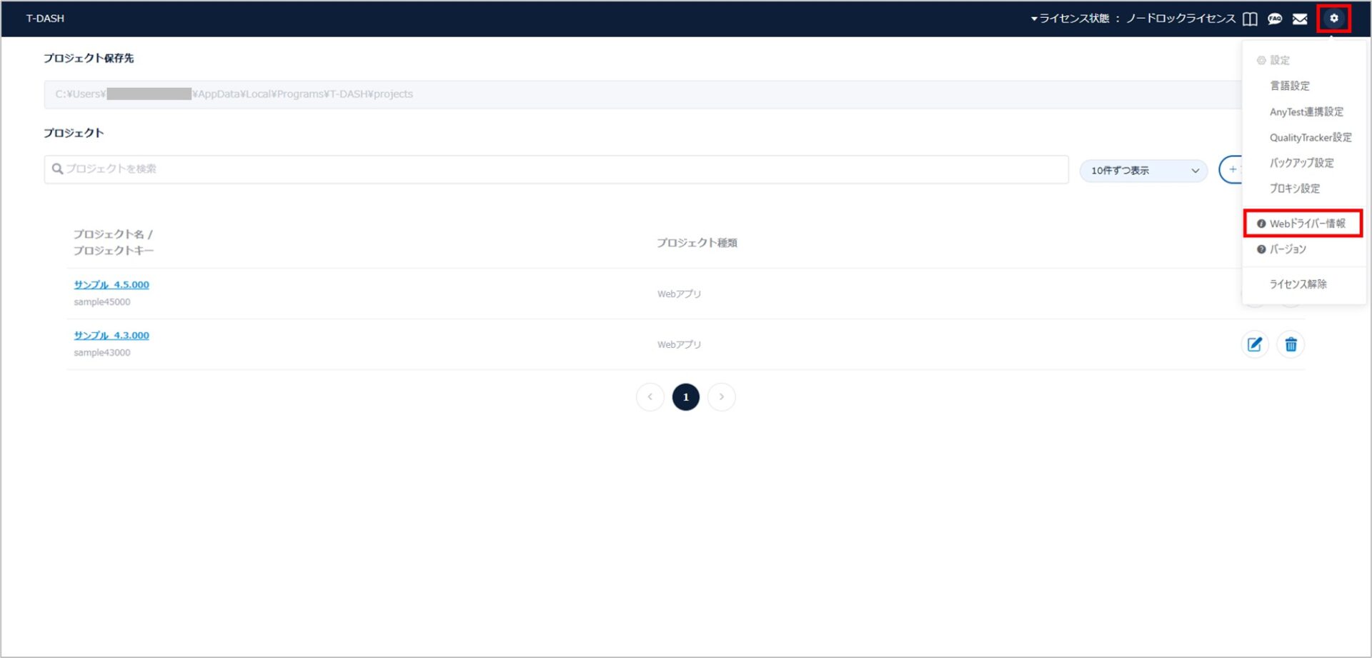 1. 「設定(歯車マーク)」→「Webドライバー情報」の順にクリックします。