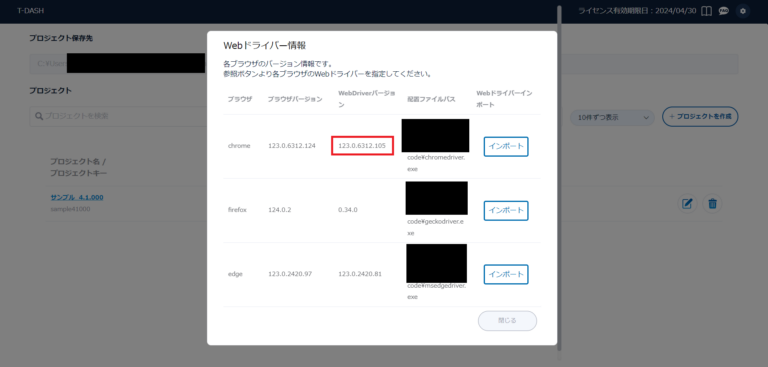 「インポート」ボタンよりご利用のブラウザのWebドライバーを指定してインポートしてください。