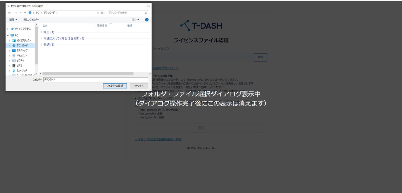 ライセンス発行情報ファイルパス選択ダイアログが開かれますので、任意のフォルダを指定し「フォルダーの選択」ボタンをクリックしてください。