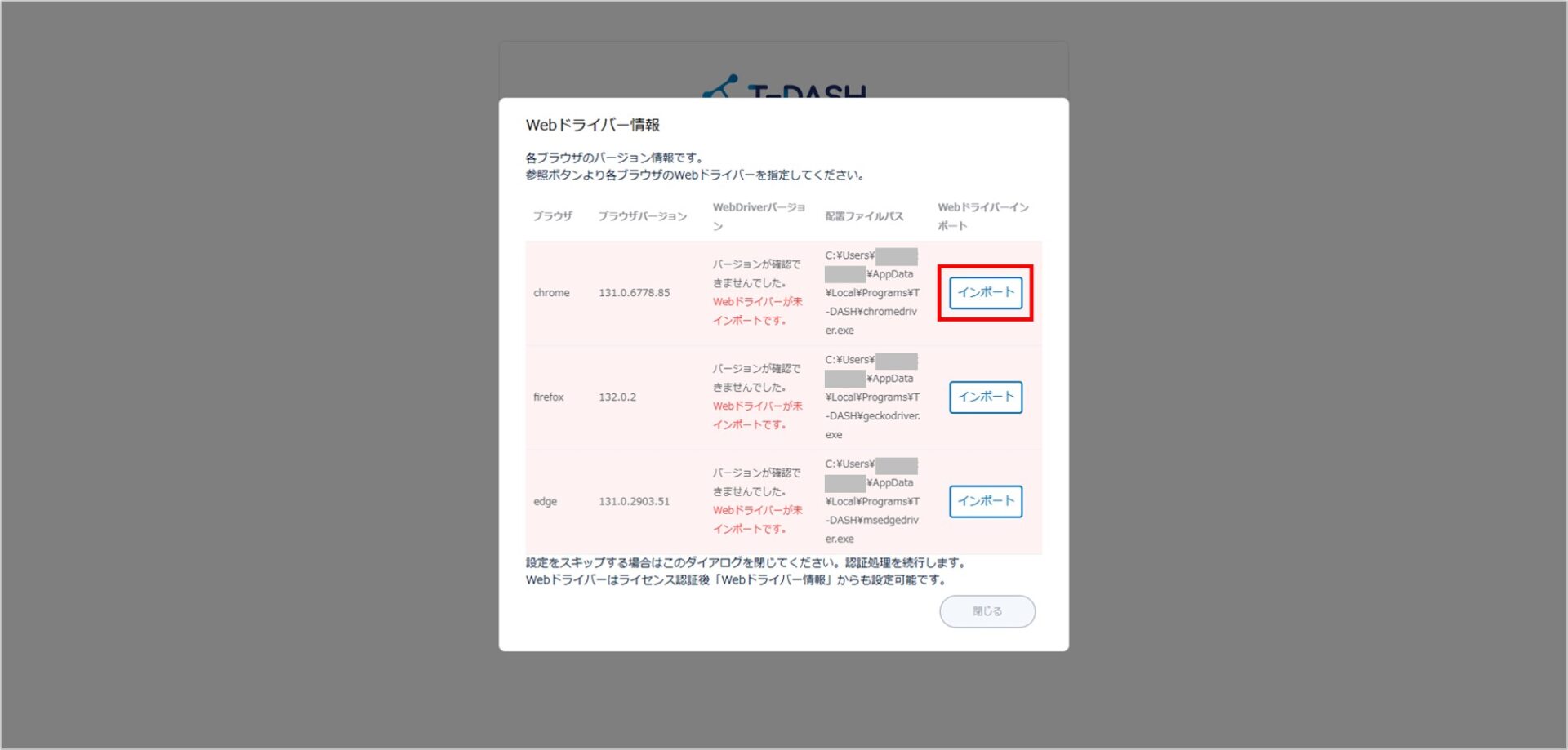 2. 「インポート」ボタンよりご利用のブラウザのWebドライバーを指定してインポートしてください。