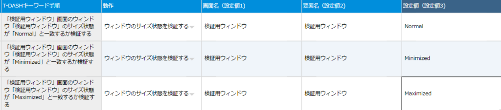 | 57 | ウィンドウ状態検証 | ウィンドウのサイズ状態を検証する | ウィンドウのサイズ状態を検証する。 設定値にはMinimized(最小化)、Normal(標準)、Maximized(最大化)のいずれかを設定する。 |