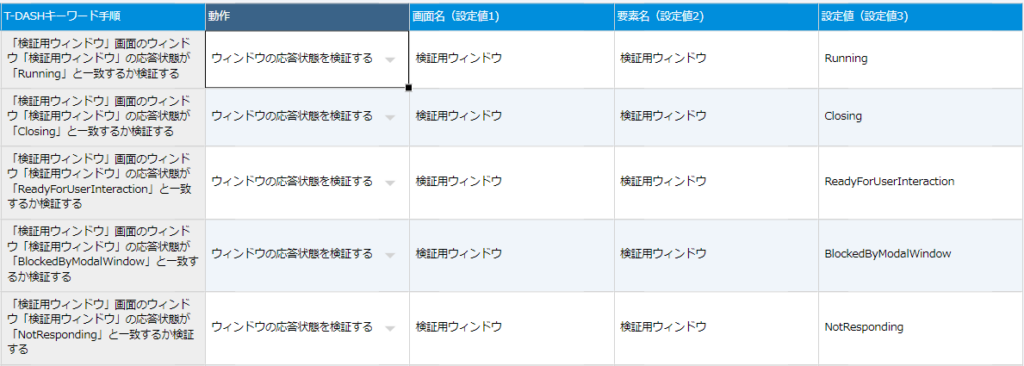 | 58 | ウィンドウ状態検証 | ウィンドウの応答状態を検証する | ウィンドウの応答状態を検証する。 設定値にはRunning(実行中)、Closing(閉じている)、ReadyForUserInteraction(ユーザーの操作受付中)、BlockedByModalWindow(モーダルウィンドウによってブロック中)、NotResponding(応答なし)のいずれかを設定する |