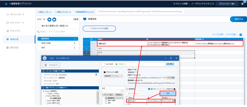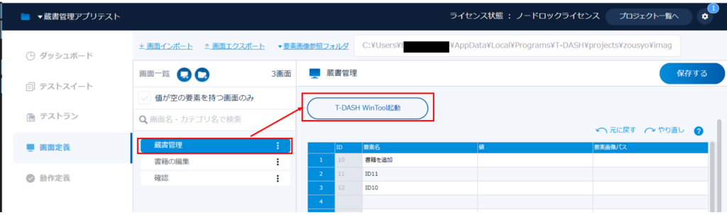 1.2. サイドメニューから、画面定義を選択、「蔵書管理」をクリックして「T-DASH WinTool」を起動する