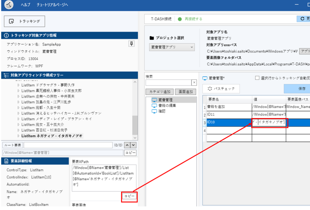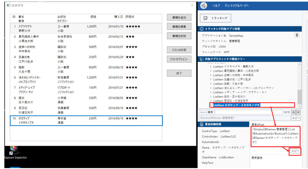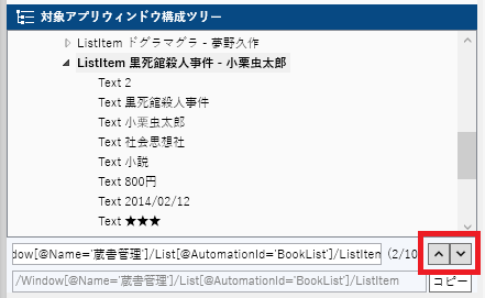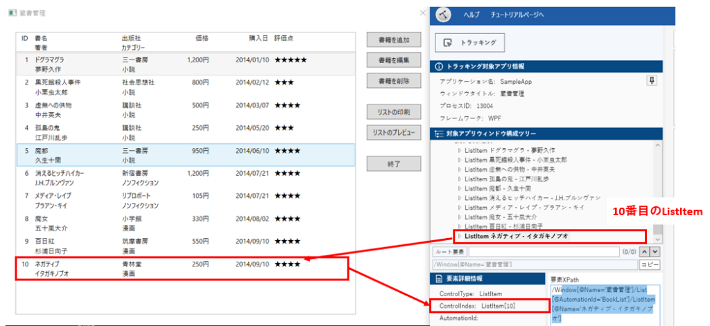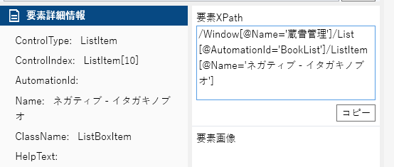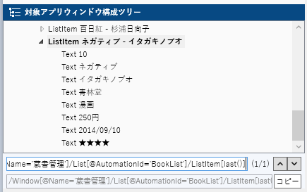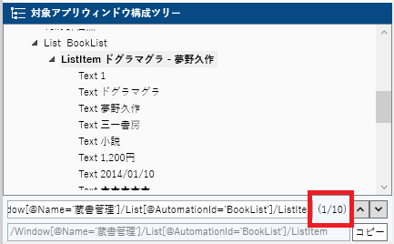 /Window[@Name=’蔵書管理’]/List[@AutomationId=’BookList’]/ListItem[10]