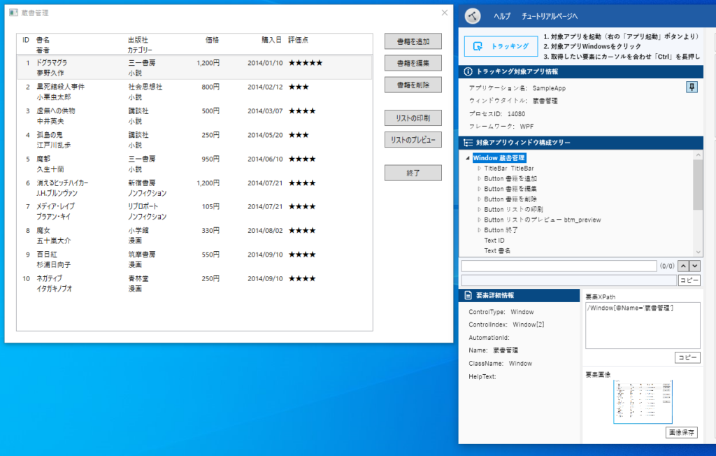 /Window[@Name=’蔵書管理’]/List[@AutomationId=’BookList’]
