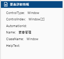 コントロールタイプ(ControlType)が「Windows」、属性が「Name」、属性の値が「蔵書管理」から、次のように書くことができます。