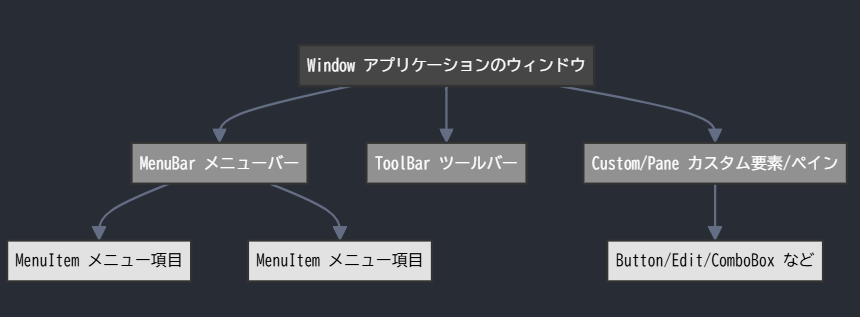 アプリのUI階層が確認できます、「Window」が最上位コンテナとなり、その下にメニューやツールバーなどが存在します。
