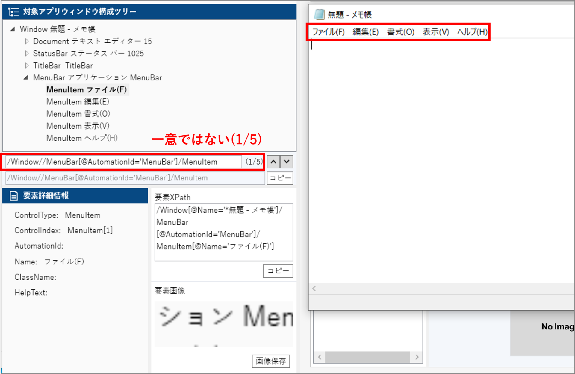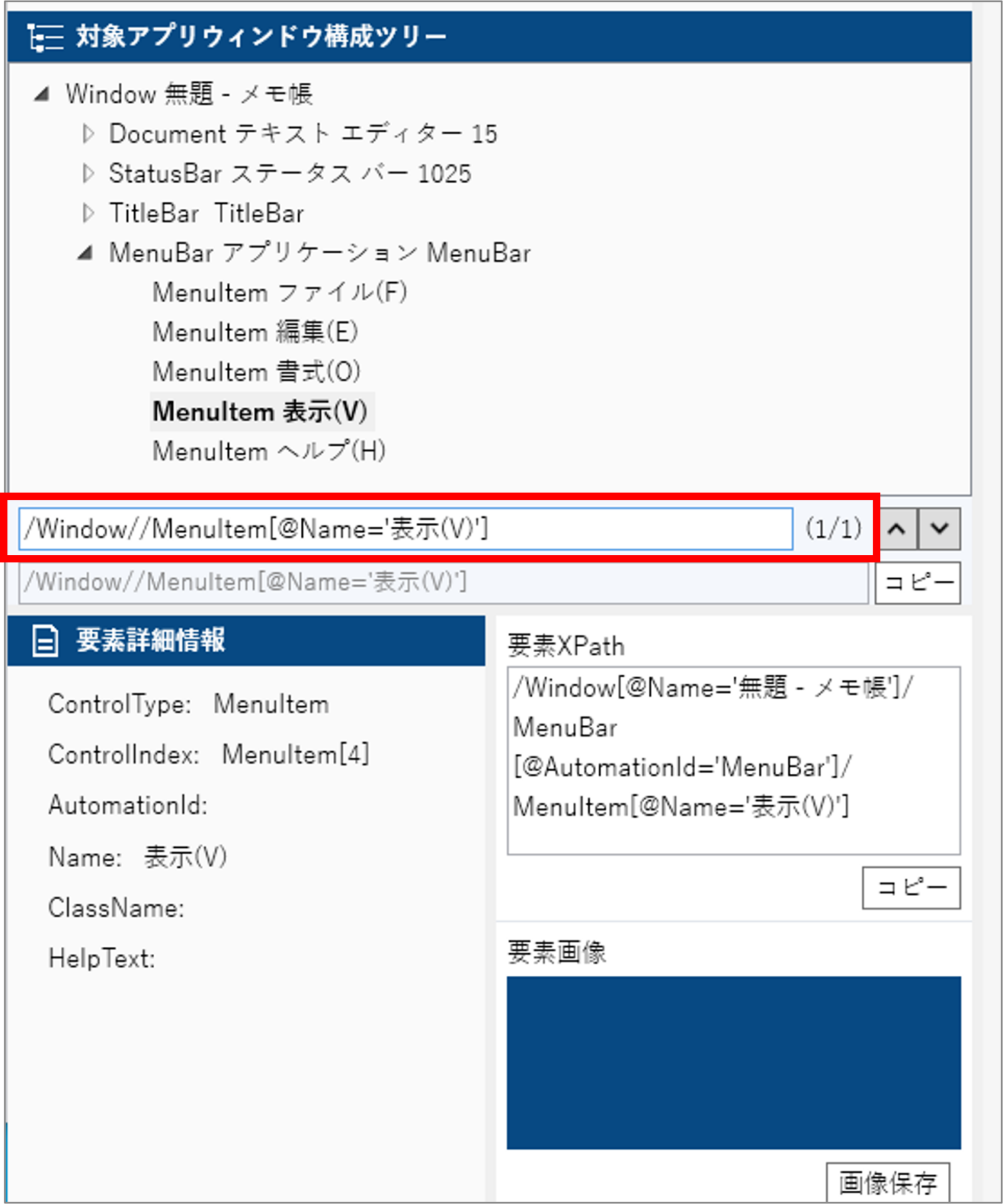 例)メモ帳アプリのメニューバーから「表示(V)」のXPathを作成する: