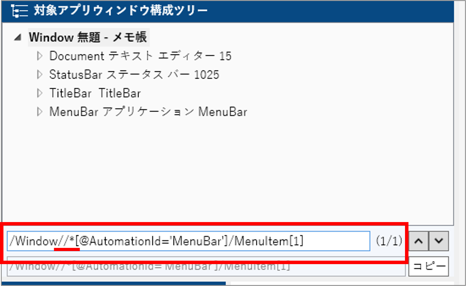 作成したXPathをテキストエリアに入力すると(1/1)と表示されて一意のパスになっていることが分かります。