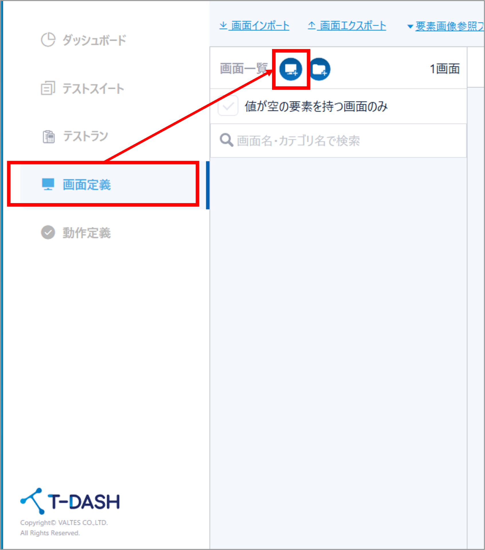 「画面定義」タブ→「画面作成」ボタンをクリックして、新規で画面を作成します。