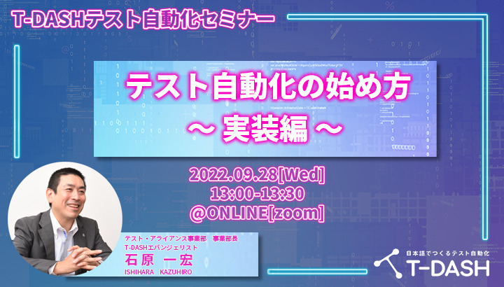 9月28日T-DASHテスト自動化セミナー「テスト自動化の始め方~実装編~」開催のお知らせ