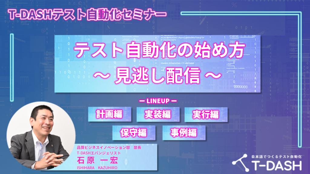 この度、ご好評いただき過去3回配信しました「【見逃し配信】T-DASHテスト自動化セミナー テスト自動化の始め方」の4回目の配信が決定致しました。