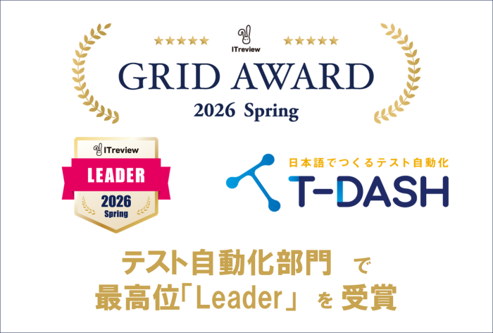 T-DASHが「ITreview Grid Award 2026 Spring」テスト自動化ツール部門で「Leader」を受賞しました!