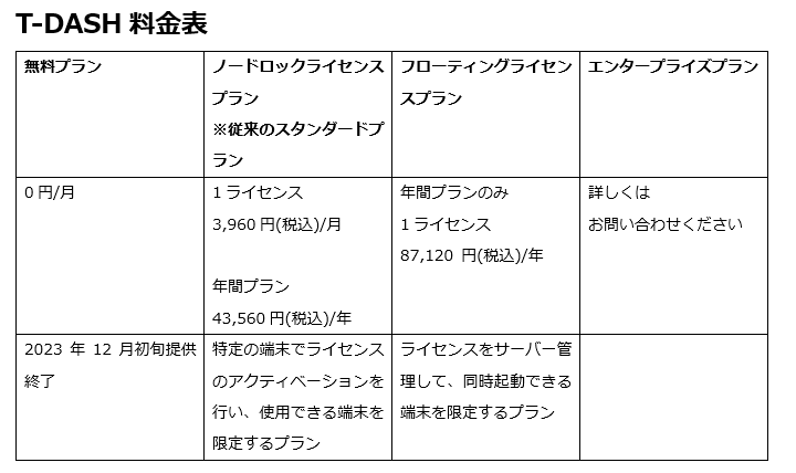2023年11月8日より、T-DASHの新料金「フローティングライセンスプラン」をご提供させていただくことになりましたので、お知らせいたします。