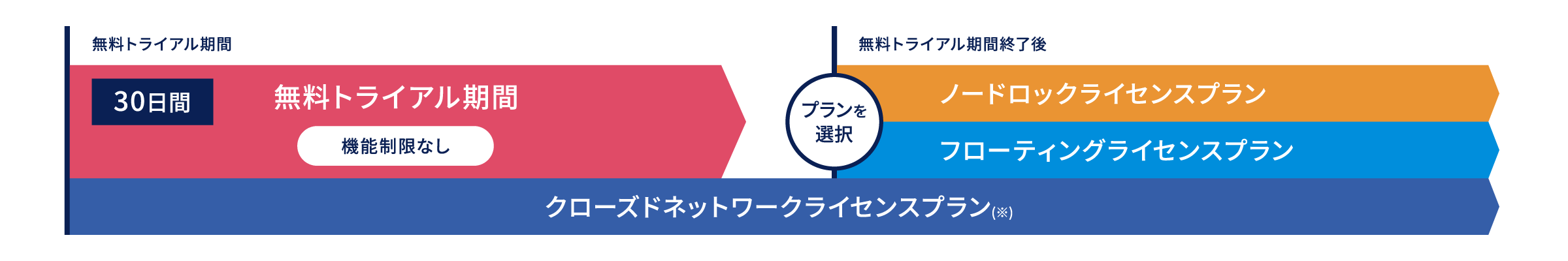 クローズドネットワークライセンスプランでは、無料トライアルの提供をしていません。 事前の検証が必要な場合はお問い合わせフォームよりお問い合わせください。 |